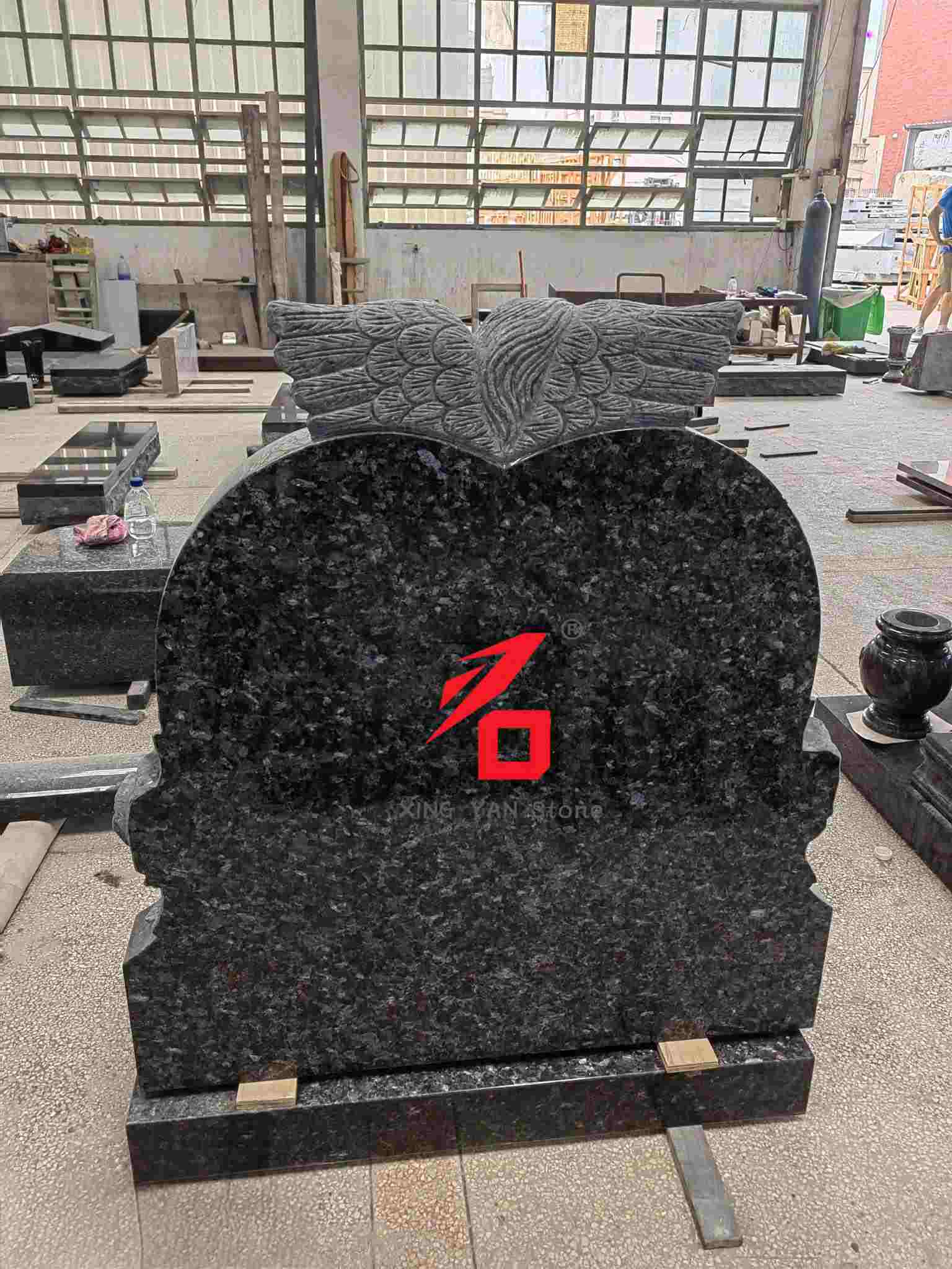 Материјал: Син бисер гранит со висока густина, тврд и отпорен на временски услови, со темна основа што зрачи свечено и достоинствено чувство;