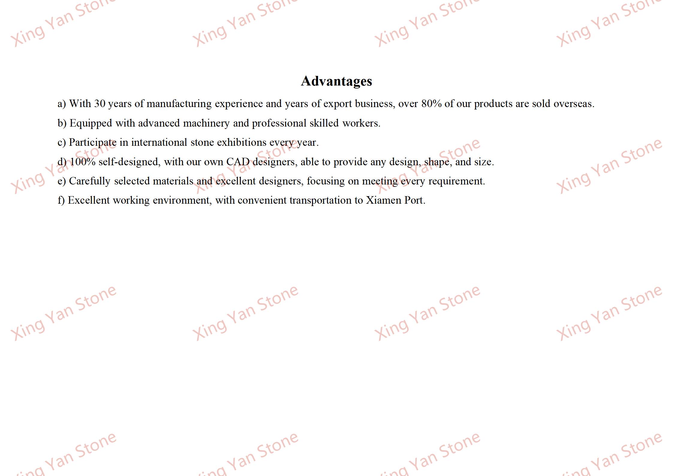 Материјал: Изработен од избрани повеќебојни парчиња гранит. Белиот и црвеникаво-кафеавиот гранит се тврд и стабилен за боја. По полирањето, површината има висок сјај и може долго време да ја одржува формата и бојата во надворешни средини.